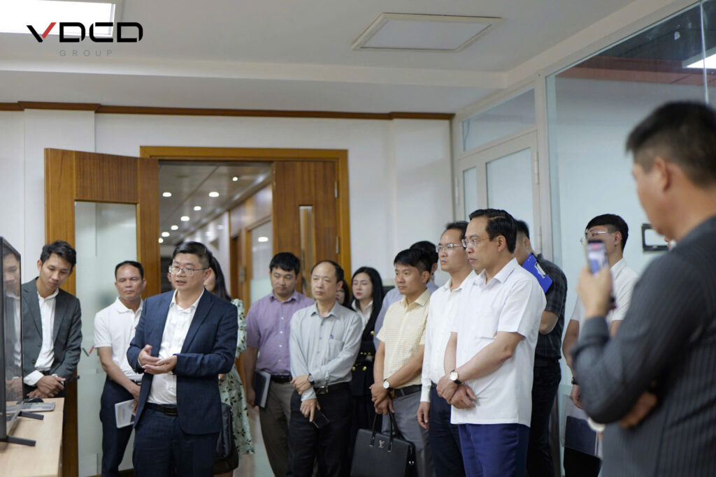 Trong khuôn khổ chuyến thăm, Ban lãnh đạo VDCD Group đã trực tiếp dẫn đoàn đại biểu tham quan hệ sinh thái công nghệ lõi đang được vận hành thực tế tại Trung tâm. Điểm đến đầu tiên là Showroom công nghệ, nơi trình diễn trực quan các giải pháp dịch vụ số hóa đột phá, trong đó nổi bật nhất là công nghệ Sa bàn ảo BIM hỗ trợ đắc lực cho quy hoạch và quản lý dự án.